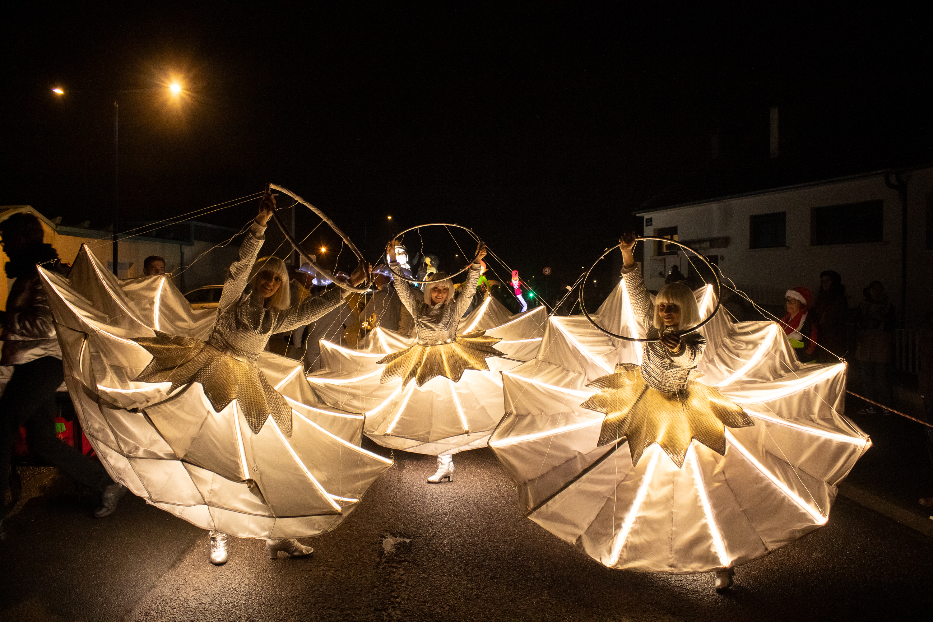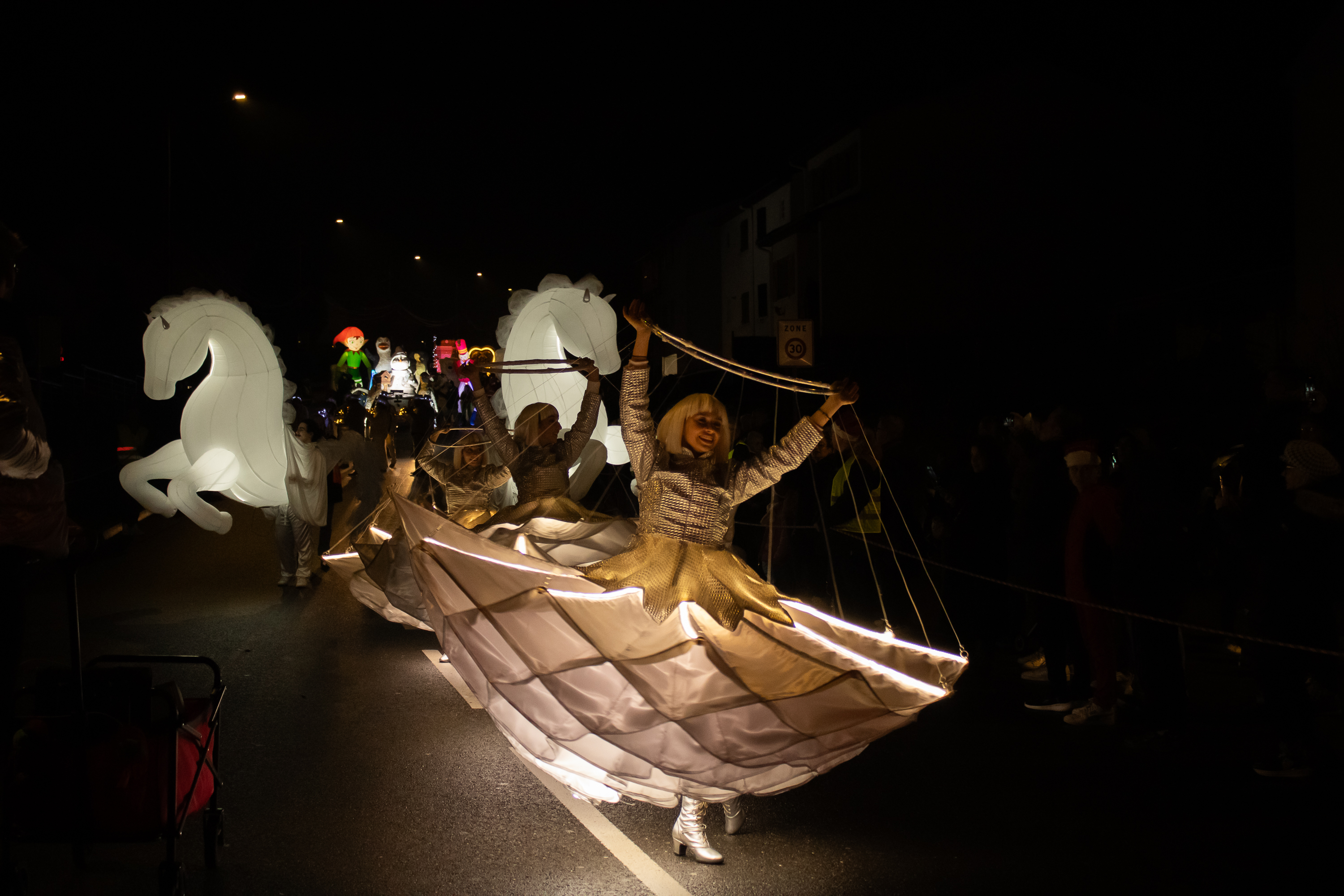 Plus de 70 personnages, accompagnés de danseurs, musiciens, mascottes, sujets illuminés et chars majestueux, ont défilé au rythme d’une musique enchantée, offrant un spectacle visuel et sonore particulièrement apprécié.