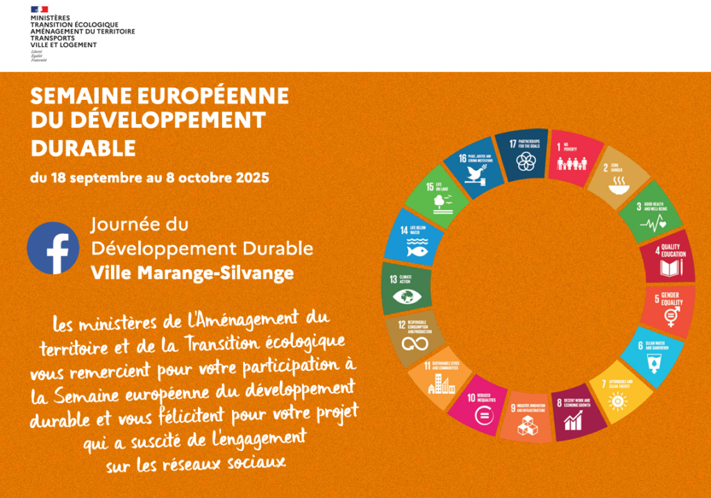 Pour la quatrième année consécutive, la commune est fière de s’impliquer dans la Semaine européenne du développement durable (SEDD). À cette occasion, la commune a reçu un remerciement officiel du Ministère de la Transition écologique, ainsi que le titre de “Coup de cœur du public”, décerné à l’issue des votes sur les réseaux sociaux. Elle souligne la capacité de la commune à fédérer et à sensibiliser un large public sur ces thématiques essentielles pour l’avenir.